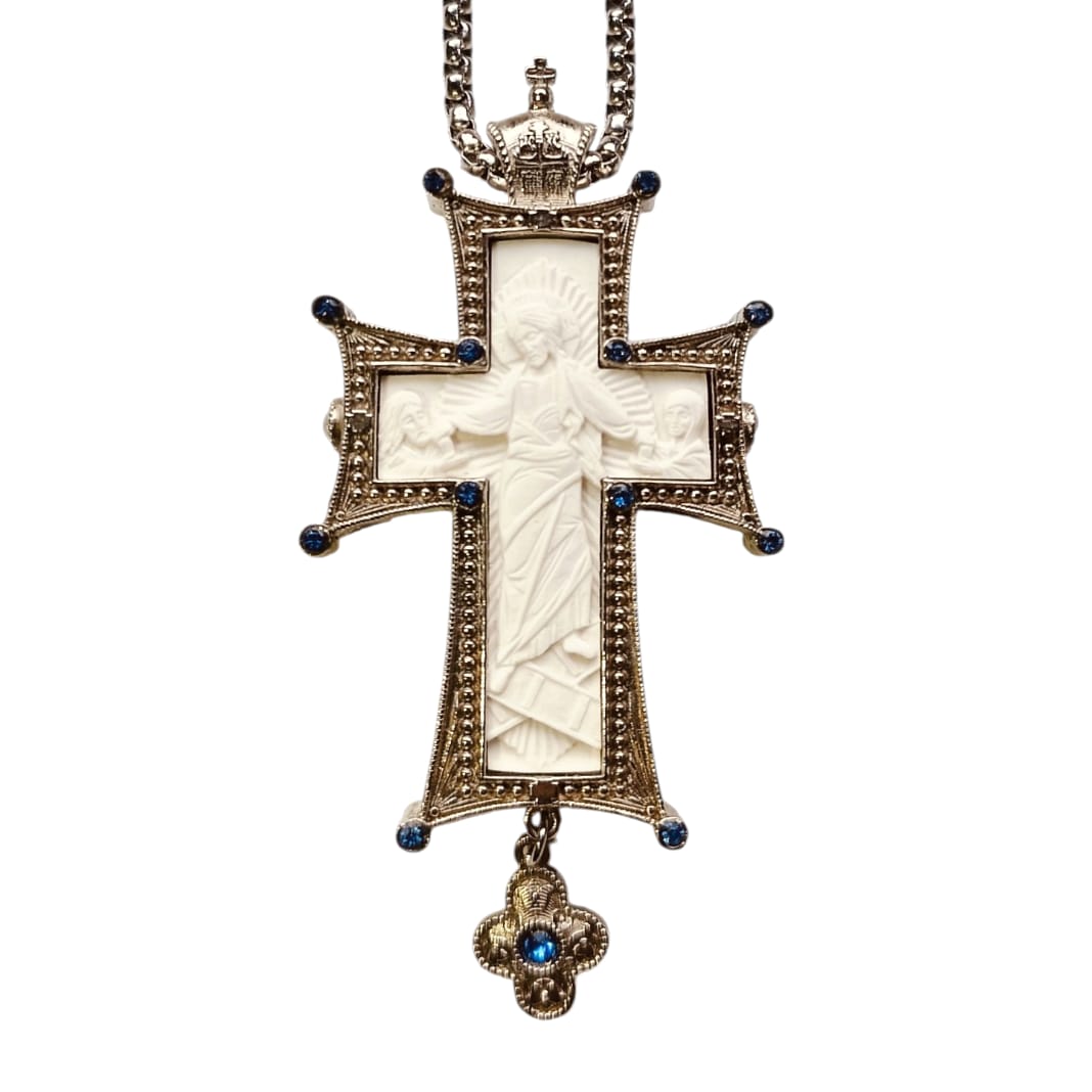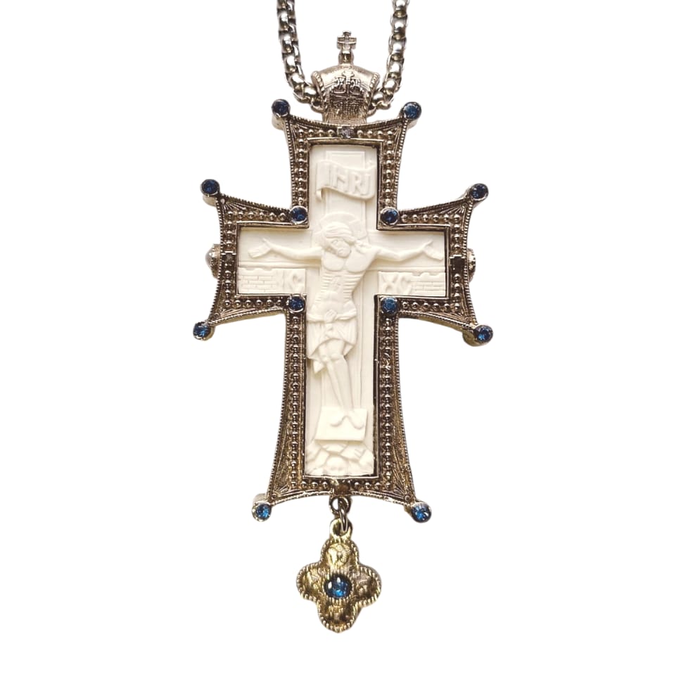 Obiectul de cult este realizat din metal si sidef (fata-verso), reprezentand Rastignirea si Invierea Domnului.